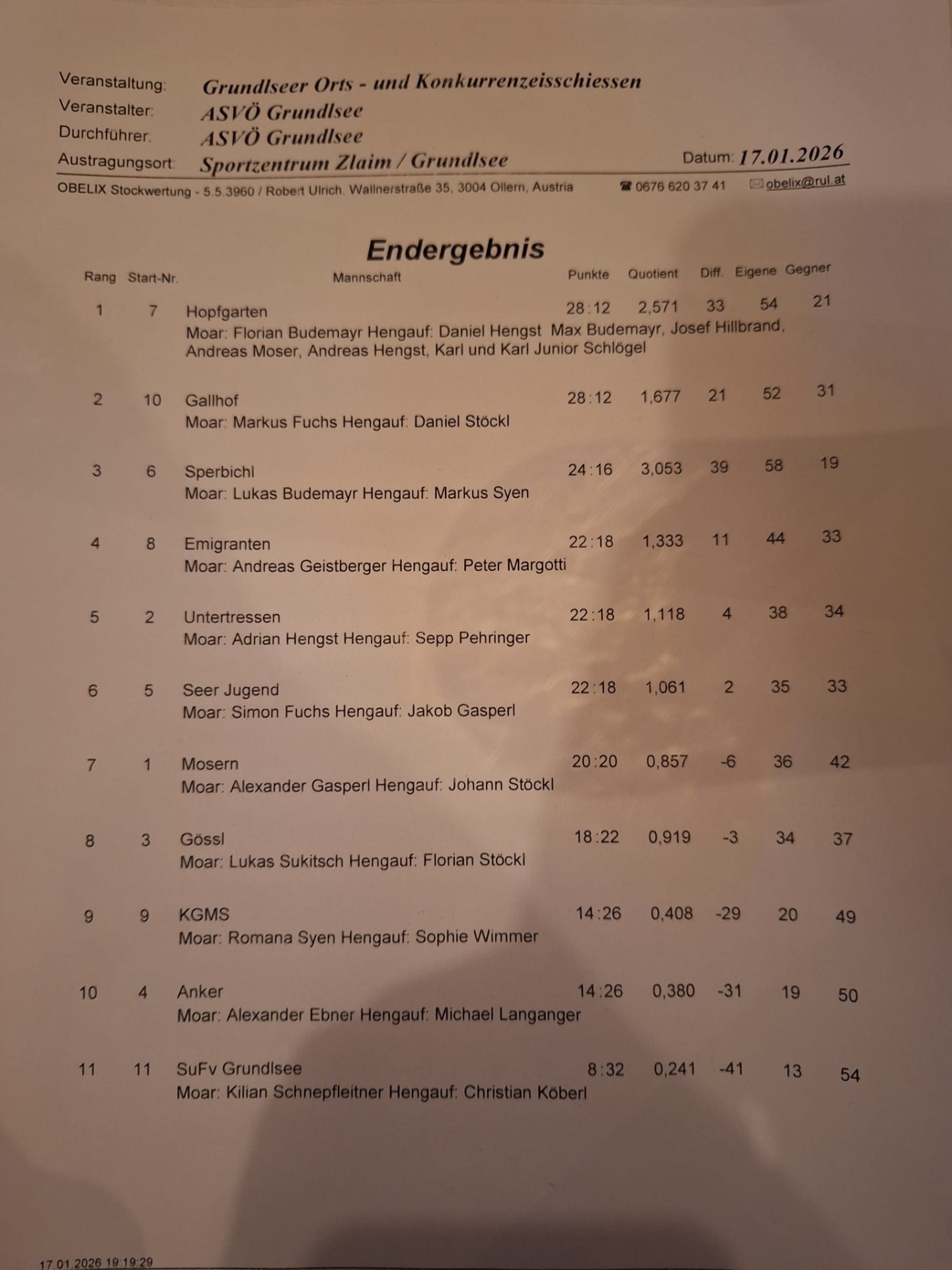 Bei besten Eisverhältnissen fand am 17. Jänner 2026 das Grundlseer Orts- und Konkurrenzeisschiessen in der Zlaim statt. Dank der Wetterbedingungen und vieler helfenden Hände konnte das Turnier bei perfekten Bedingungen auf Natureis am Tennisplatz stattfinden. Die Mannschaft "Hopfgarten" (mit Moar Florian Budemayr/ Hengauf Daniel Hengst) sicherten sich den ersten Rang, vor "Gallhof" ( Markus Fuchs/ Daniel Stöckl) und "Sperbichl" (Lukas Budemayr/ Markus Syen). Die weitere Reihung: 4. "Emigranten", 5. "Untertressen", 6. "Seer Jugend", 7. "Mosern", 8. "Gössl", 9. “KGMS“, 10. “Anker“, 11. “SuFv Grundlsee. Die Siegerehrung fand in der Klamgwerkstatt des Narzissendorf’s Zloam statt. Der ASVÖ Grundlsee bedankt sich bei allen Teilnehmern, Sponsoren und Helfern