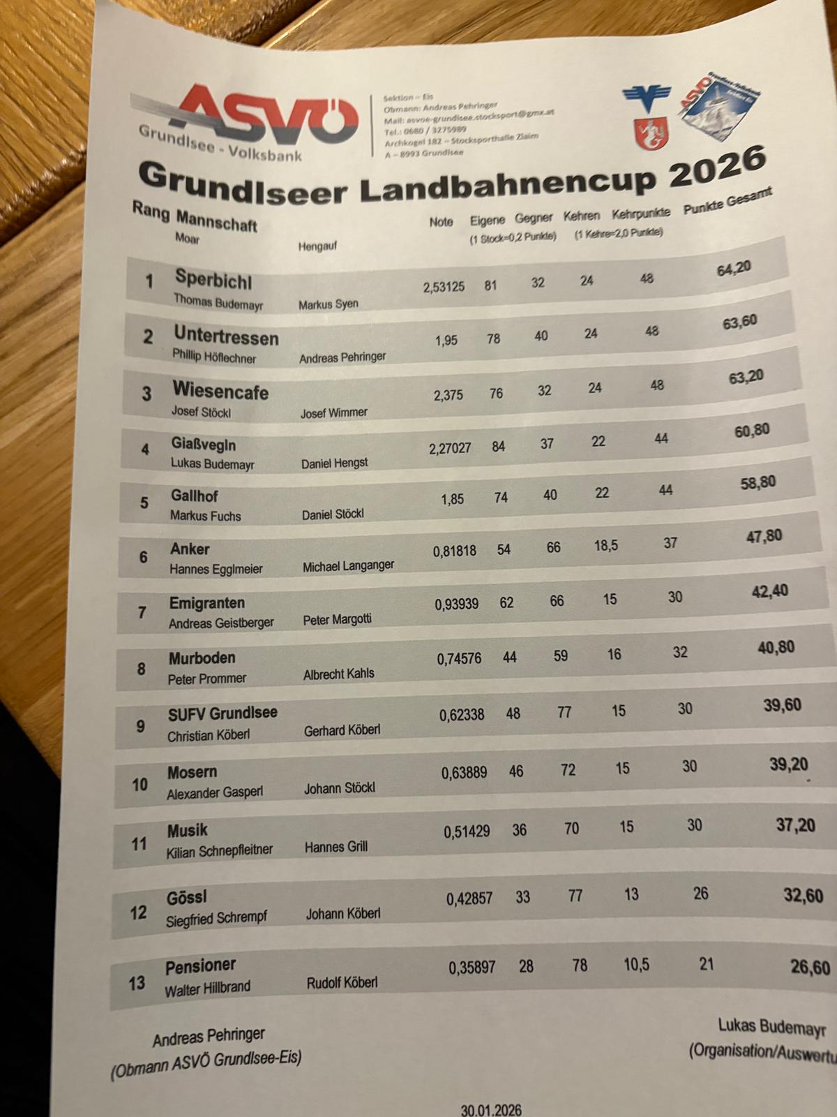 Am 7. Jänner begann der Landbahnencup 2026. Auf 4 Bahnen ( Gallhof, Kreuz, Murboden und Anker) kämpften 13 Mannschaften im Modus Jeder gegen Jeden um den Titel. Aufgeteilt auf insgesamt 7 Spieltagen wurde jeden Mittwoch und Freitag bei besten Bedienungen geschossen. Die Mannschaft "Sperbichl" ( mit Moar Thomas Budemayr / Hengauf Markus Syen) konnte sich den 1. Rang sichern, vor "Untertressen" ( Philip Höflechner / Andreas Pehringer) und "Wiesencafe" ( Josef Stöckl / Josi Wimmer). Die weiteren Reihungen: 4. "Giaßvegl", 5."Gallhof", 6. "Anker", 7. "Emigranten", 8. "Murboden", 9. "SUFV Grundlsee", 10. "Mosern", 11. "Musik", 12. "Gössl" und 13. "Pensioner". Der ASVÖ Grundlsee bedankt sich bei allen Helfern und Bestspendern für die Unterstützung und vor allen bei allen Bahnmachern und Ausschanken für die hervorangende Arbeit.